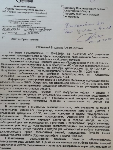 Руководитель АО «Газпром газораспределение Оренбург» и врио главы администрации Пономаревского сельсовета получили представления об устранении нарушений, в том числе в них содержалось и требование перенести газопровод с земельных участков (!).