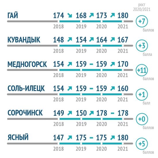 На втором месте - Оренбург. Областной центр, понятное дело, не может быть в аутсайдерах. По 180 баллов заслужили Бузулук, Гай и Ясный. Сорочинск за год не прибавил ни балла, сохранив прошлогодний показатель в 178 баллов, у Бугуруслана их 176, Медногорска - 170 (+11 баллов), Кувандыка - 167 (+3 балла), Орска - 165 (+12 баллов), Соль-Илецка - 160 (+1 балл) и у Абдулино - 157 баллов (+14 баллов).
