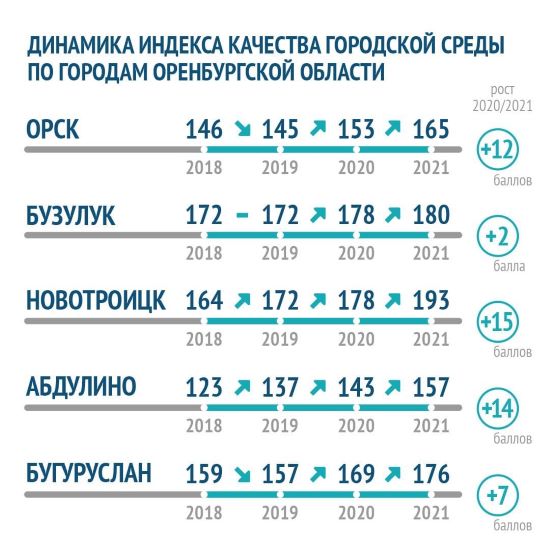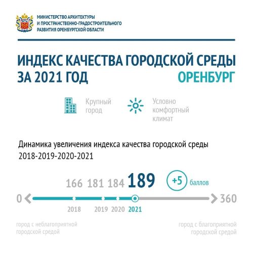Оренбург набрал по индексу качества горсреды в 2021 году 189 баллов из максимальных 360, прибавив за год 5 баллов (в 2018 году индекс качества городской среды у нас составлял 166 баллов).