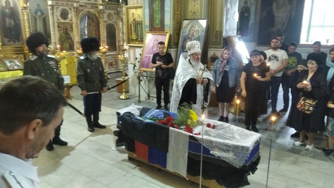 Гроб с телом погибшего Александра Крюкова был покрыт государственным флагом Российской Федерации, а также флагом, который привезли воины-разведчики. В почетном карауле стояли казаки в папахах с шашками наголо. Рядом с гробом - венки с лентами, множество цветов. Отпевание в церкви провел настоятель храма Покрова Пресвятой Богородицы протоиерей Анатолий Семенюк.