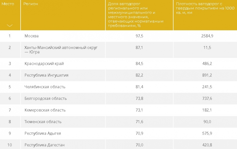 Лидер рейтинга, что нисколько не удивительно - Москва. Там нормативным требованиям отвечают 97,5% региональных или местных трасс. В лидирующую группу также входят ХМАО, Краснодарский край, Ингушетия, Челябинская область, где более 80% дорог соответствуют требованиям. Более 70% таких дорог в Белгородской, Кемеровской, Тюменской областях и Республиках Адыгея и Дагестан.