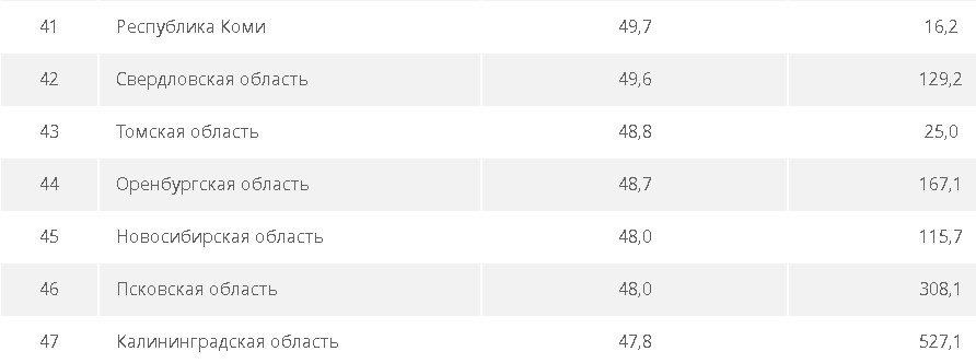 Оренбургская область - на 44 месте. В нашем регионе доля автодорог регионального или межмуниципального и местного значения, отвечающих нормативным требованиям, составляет 48,7%, то есть, меньше половины. Плотность автодорог с твердым покрытием на 100 кв.м,км - 167,1. Примерно те же цифры у Томской области, Новосибирской и Псковской области, которые заняли места рядом с нами.
