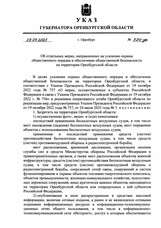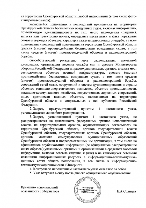 Врио губернатора Оренбургской области Евгений Солнцев подписал указ, направленный на применение мер по усилению охраны общественного порядка и обеспечения общественной безопасности на территории Оренбургской области. В соответствии с указом, средствам массовой информации, жителям и гостям региона запрещено вести фото и видеосъемку БПЛА и последствий их применения, мест падения обломков, мест поражения, характер и тяжесть нанесенного ущерба.