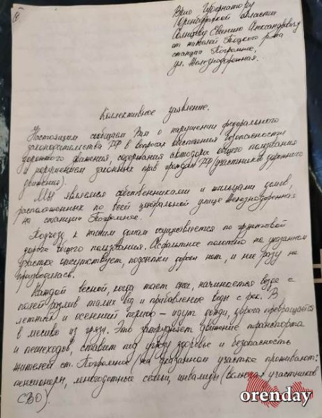 Каждой весной, когда тает снег, начинается прилив воды с полей. В летний и осенний период идут дожди, дорога превращается в месиво из грязи. На выезде со станции, до проведения работ по асфальтированию дороги, нужно проложить трубу для пропуска талых вод. Тогда новую дорогу не будет топить водой», - говорят местные в своём обращении врио губернатору Оренбургской области Евгению Солнцеву. Жители меленькой станции возлагают большие надежды на руководство региона. Кто-то же должен прервать порочный круг вечных обещаний...