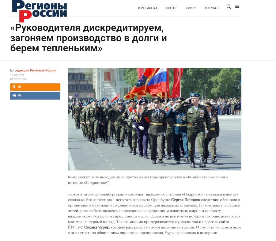 - Вы прочтите статью, она не только опубликована в бумажной версии журнала, но и на сайте издания №8 за 2022 год. Фамилий предполагаемых рейдеров я не называла, но дала описание того, кто может иметь не только интерес к установлению монополии на рынке социального питания Оренбургской области, но и возможности. Согласитесь, одного желания мало. Нужны связи в правоохранительных структурах, суде, нужна информация о планах государства относительно увеличения финансирования питания школьников в цифрах и датах. О том, что всех школьников будут обеспечивать бесплатным питанием, говорят уже почти год. Судя по тому, как активизировали процесс давления на Попцова в последние месяцы, приняты высокие решения о сроках и объемах финансирования, обозначены формы. Люди, обладающие такой информацией, понимают, что нужно торопиться.