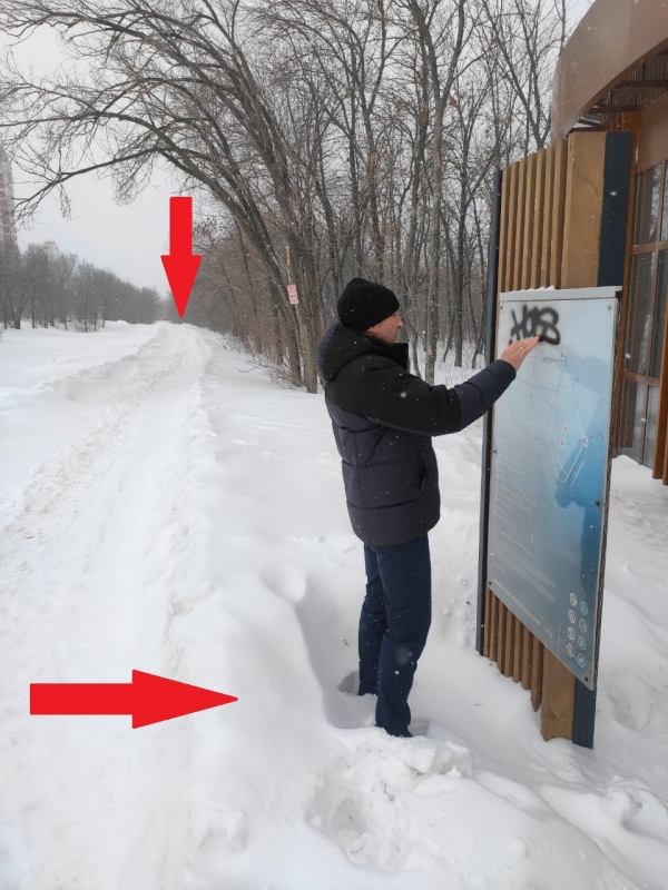 Парк привел Объедкова в негодование, и не по той причине, что туалеты там до сих пор не работают, но должны были начать функционировать еще осенью 2023 года, а поскольку обнаружил набег вандалов. Хулиганы погнули навигационный указатель и оставили «наскальную живопись» на карте.