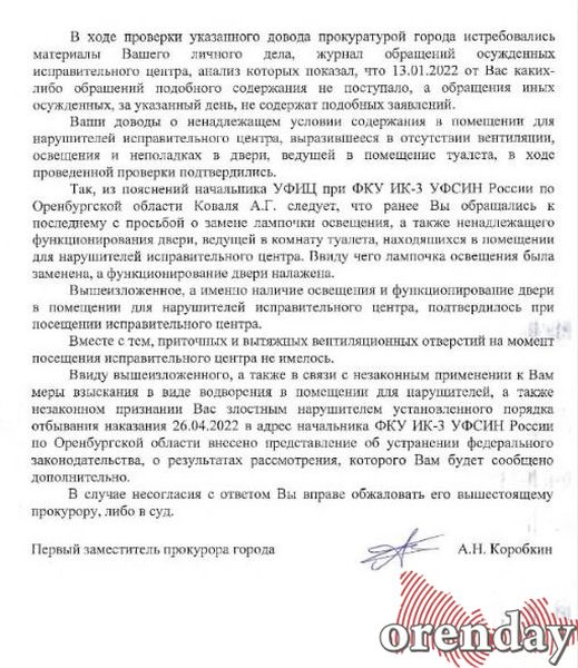 В связи с вышеизложенным, а также в связи с незаконным применением к вам меры взыскания в виде водворения в помещение для нарушителей, а также незаконном признании вас злостным нарушителем установленного порядка отбывания наказания, в адрес начальника ФКУ ИК-3 УФСИН России по Оренбургской области Коваля А.Г. внесено представление об устранении нарушений федерального законодательства, - уточнили в прокуратуре.