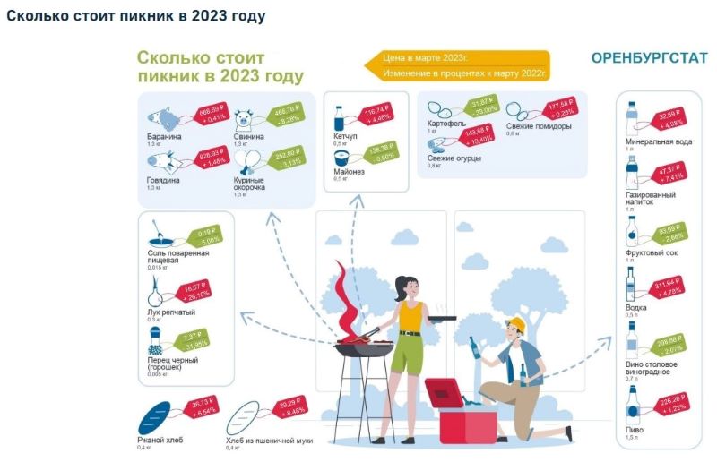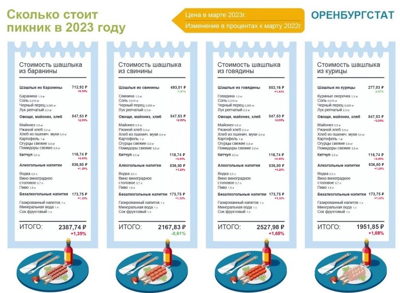 По сравнению с весной прошлого года в Оренурге мясо не особо подорожало, а свинина даже стала стоить чуть дешевле, а вот овощи, кетчуп, хлеб, газированные напитки, как и алкогольные выросли в цене. Шашлык из свинины весом боле килограмма обойдется под 500 рублей, из говядины будет стоить значительно дороже - более 850 рублей. Самый бюджетный вариант приготовления шашлыка - из курицы, обойдется менее чем в 300 рублей. Если же прикупить к шашлыку овощи и напитки, то стоимость пикника уже превысит 2000 рублей. Но оно того в майские праздники стоит.