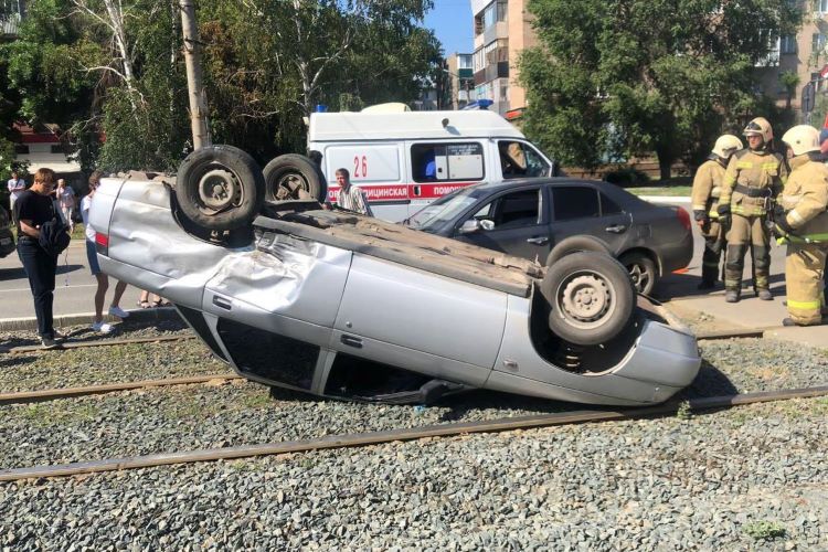 На проспекте Ленина в Орске сегодня ВАЗ-2110 столкнулся с иномаркой "Geely", от сильного удара отечественную легковушку бросило на трамвайные пути, "десятка" опрокинулась на крышу.