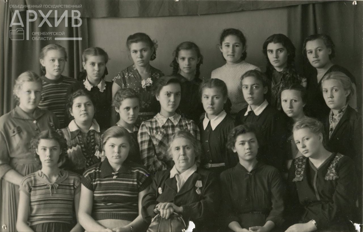 Заслуженный учитель школы РСФСР О.С. Тышевская (в центре, нижний ряд) с ученицами Железнодорожной средней школы станции Оренбург. 1956 г.