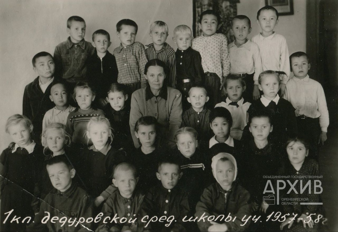 Учитель начальных классов Дедуровской средней школы Оренбургского района Н. Г. Дубская с первоклассниками. 1958 г.