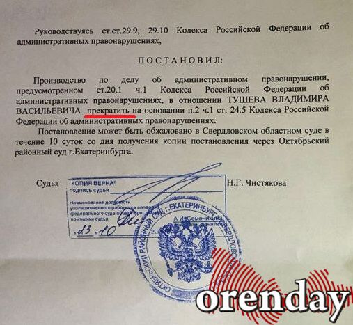 На следующее утро Владимира привезли к мировому судье. Та, задав вопрос, почему он не подписал протокол, решила прочитать ему материал вслух, но… не смогла и сама. Выслушав Тушева, созвонившись со следователем, судья постановила - прекратить производство по делу об административном правонарушении в отношении оренбуржца.