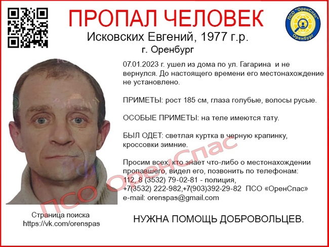 Напомним, как сообщал Orenday, 45-летний Евгений Исковских 7 января ушел из дома, расположенного по проспекту Гагарина в Оренбурге, и отправился в неизвестном направлении.
