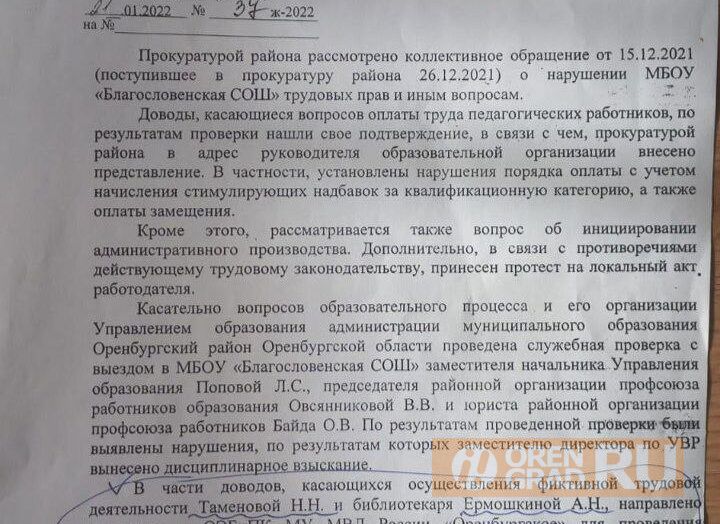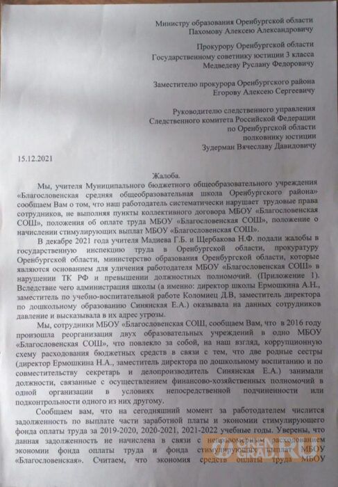 Коллеги из "Оренграда" сообщают, что женщина работала в Благословенской СОШ. Педагоги рассказывают, что сумма ущерба на самом деле выше, нежели указана в полицейских сводках. И к уголовной ответственности, считают учителя, привлекать нужно не только заместителя директора, но и самого директора, которые, к слову, являются родными сестрами и депутатами местного сельсовета. Изначально жалоба от педагогического состава была направлена именно на действия директора школы. В декабре 2021 года коллективное письмо учителя направили в Министерство образования, в Прокуратуру и Следственный комитет.