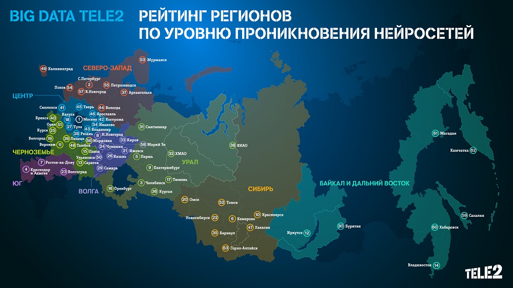 В макрорегионе «Урал» Tele2 интерес к нейросетям распределился следующим образом: самые активные клиенты живут в Челябинске, на втором месте жители Перми, на третьем – абоненты из Екатеринбурга, на четвертом – клиенты из Оренбурга, замыкают пятерку жители Тюмени. Далее в рейтинге по убывающей идут жители Сургута, Сыктывкара, Кургана и Салехарда.