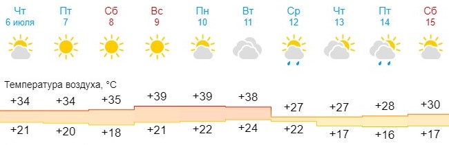 А в последующие дни, по прогнозам Gismeteo, будет еще жарче. В воскресенье и понедельник, например, днем прогнозируют +39 градусов, даже ночью столбик термометра не опустится ниже +22...+24 градусов. Ниже +30 днем же и небольшой дождик обещают лишь к следующей среде. Так что выходные, как раз после праздника Ивана Купалы, который отмечается 7 июля, лучше провести на берегу какого-нибудь водоема или на даче у бассейна, только, смотрите, не обгорите.