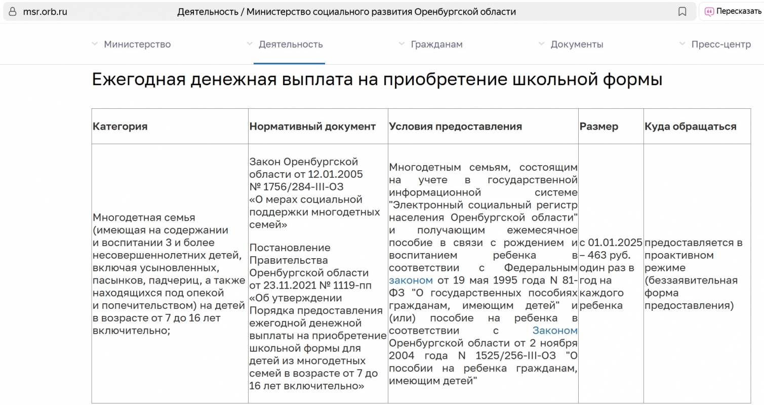 В Оренбургской области ежегодно многодетные семьи получают выплаты на покупку школьной формы. Вот только размер ее по нынешним временам смешной - 463 рубля в 2025 году. Что аж на 20 рублей больше, чем в 2024-ом.