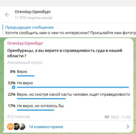 Несколько дней назад Orenday задал вопрос: «Оренбуржцы, а вы верите в справедливость суда в нашей области?». В опросе приняли участие более шестисот человек. 52% опрошенных сообщили, что не верят в справедливость в стенах судов. Следующий по популярности ответ - «Верю, но смотря какой касты человек ищет справедливости» - набрал 27%. 17 % респондентов не верят в справедливость, но им бы хотелось этого. И лишь 8 % заявили, что верят.