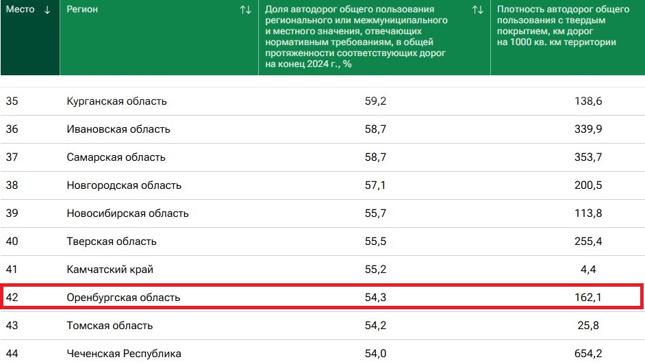 Но где же Оренбургская область? Казалось бы, дороги в степном крае оставляют желать лучшего, и регион должен волочиться в конце списка. Даже после капитального ремонта некоторые магистрали начинают изобиловать дефектами спустя несколько месяцев, а в удаленных населенных пунктах об асфальтированной рубашке могут только мечтать.