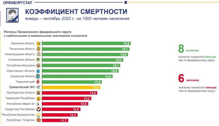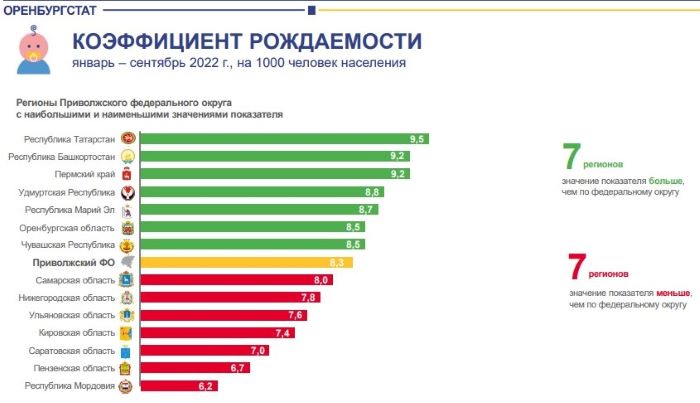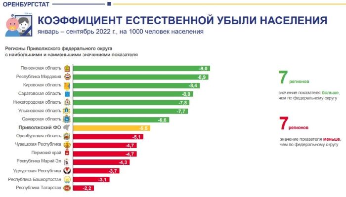 Естественная убыль населения за девять месяцев в регионе составила 7266 человек. В Приволжском федеральном округе наименьшая естественная убыль населения в Татарстане и Башкортостане, а наибольшая - в Пензенской области и Мордовии, выше чем у нас в Саратовской и Самарской областях. Эти же регионы оказались в лидерах и аутсайдерах по рождаемости и смертности.