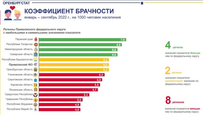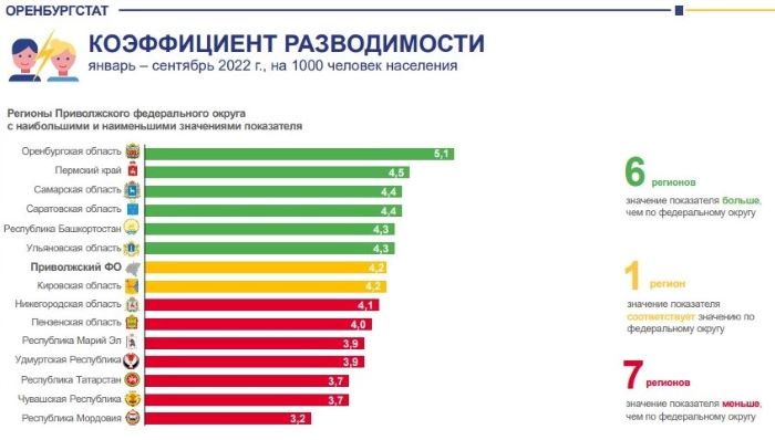 По сравнению с прошлым годом количество сыгранных свадеб уменьшилось в Оренбуржье почти на четыре процента, а число разводов, напротив, выросло почти на пять процентов. Что примечательно, Оренбуржье по числу разводов лидирует среди других регионов ПФО. Меньше же всего браки распадаются в ПФО в Мордовии и Чувашии.
