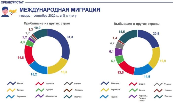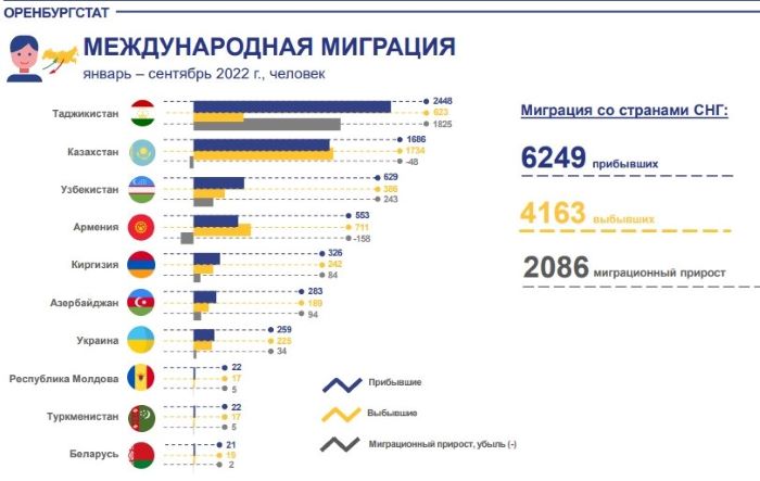 В этом году в Оренбуржье наблюдается миграционное снижение, из региона больше народу уезжает, чем приезжает сюда. Число переселяющихся в пределах области уменьшилось на 2208 человек или на 11 процентов. С начала года по сентябрь в область прибыло 17 473 человека, а выбыло за ее пределы 19 236 человек (без внутриобластной миграции). В этом году по сравнению с предыдущим наблюдается прирост числа приезжающих из государств-участников СНГ (более чем на 38 процентов). Наиболее значителен приток мигрантов из Таджикистана, Узбекистана, Азербайджана и Киргизии.