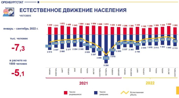 По данным Оренбургстата, за девять месяцев этого года в Оренбургской области появилось на свет 12 244 малыша, в то же время скончались 19 510 жителей региона. Что печально, рождаемость по сравнению с аналогичным периодом прошлого года упала еще на 10,5 процента, уровень смертности в отличие от пандемийного 2021 года также снизился - аж на 20,5 процента. Кстати, в прошлом году самая большая смертность в Оренбургской области наблюдалась в октябре, а самая большая рождаемость - в августе. В этом году больше всего земляков умерло в марте, а больше всего новорожденных было также в августе.