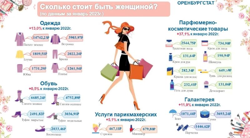 Оренбурстат брал для анализа, чтобы посчитать, сколько стоит быть женщиной, цены января 2023 года и сравнивал с январем 2022 года. Итак, больше всего за год в Оренбуржье подорожали парфюмерно-косметические товары - на 37 процентов, ценники на одежду выросли за год на 13 процентов, незначительно прибавила в цене обувь, поход в парикмахерскую стал стоить дороже более чем на 5 процентов.
