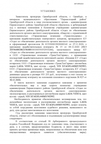 Областная прокуратура просит арбитражный суд обязать КУ «ОДОМСУ» возвратить ООО «Управляющая компания «ТрансТехСервис» автомобили марок LADA VESTA и Lada Niva, а ООО «Управляющая компания «ТрансТехСервис» вернуть КУ «ОДОМСУ» денежные средства в размере 933 233 и 846 810 рублей 66 копеек, полученные в счет оплаты по муниципальному контракту. Также в тексте искового заявления говорится о принятии обеспечительных мер в виде запрета КУ администрации Переволоцкого района «ОДОМСУ» эксплуатировать и распоряжаться данными автомобилями.