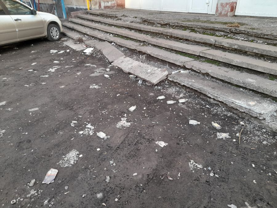 Например, в таком виде оказалась прилегающая к служебному входу в женскую консультацию территория на ул. Конституции СССР. Благо, здесь уже всё приведено в полный порядок.