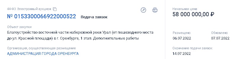 6 июля чиновники объявили торги на завершение благоустройства Восточной части набережной реки Урал (1 этап). Максимальная стоимость работ - 58 млн. рублей, работу необходимо выполнить до 1 декабря 2022 года. Тендер уже доступен на "Госзакупках": заявки принимаются до 14 июля, а непосредственно аукцион состоится на следующий день.