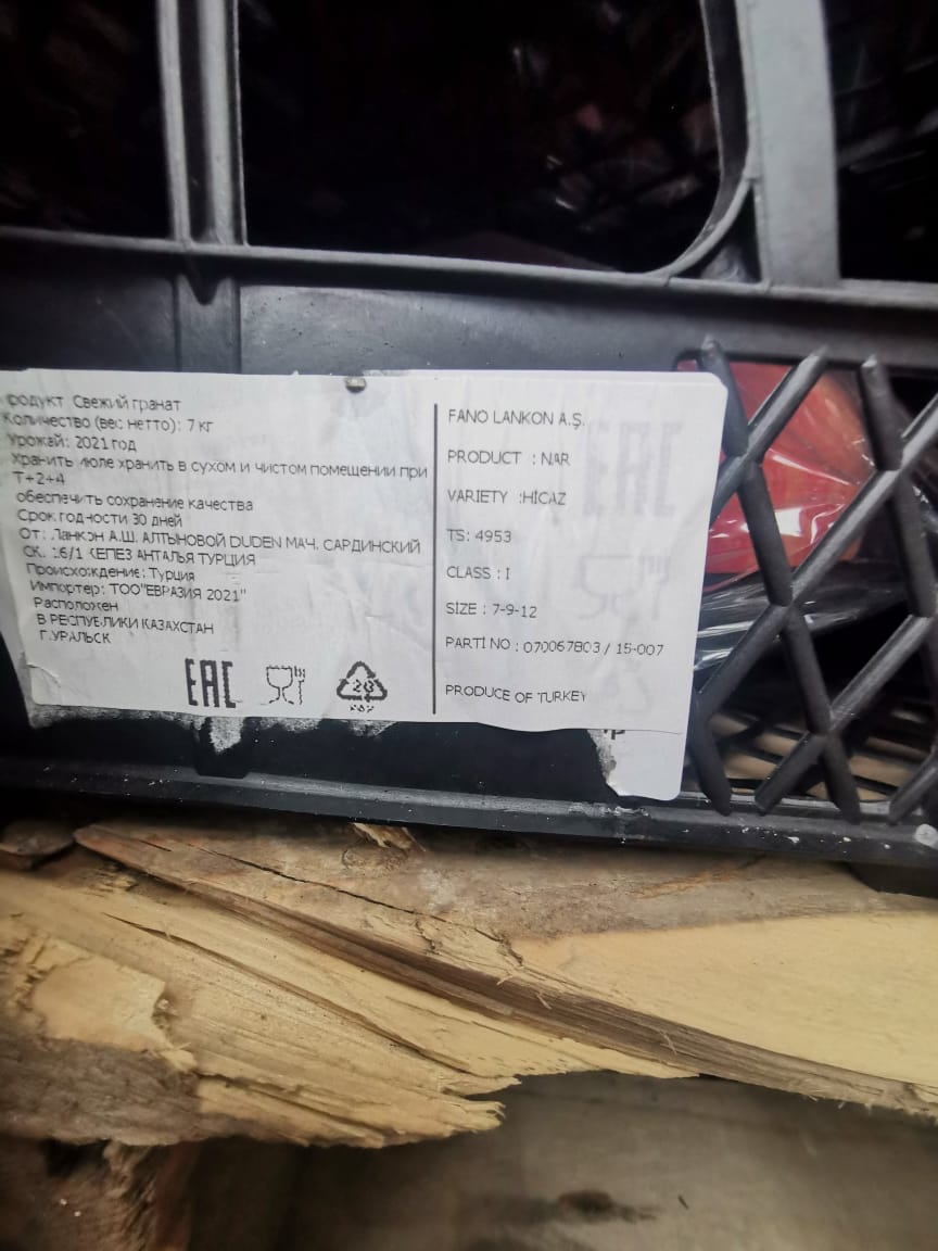 При проведении карантинного фитосанитарного контроля подкарантинной продукции установлено, что гранаты поступили в сопровождении недействительного фитосанитарного сертификата, выданного в Республике Казахстан. Информация на маркировке не соответствовала информации, указанной в фитосанитарном сертификате: в соответствии с маркировкой, на упаковке страной происхождения является Турция, при этом, в фитосанитарном сертификате указана страна происхождения - Узбекистан.