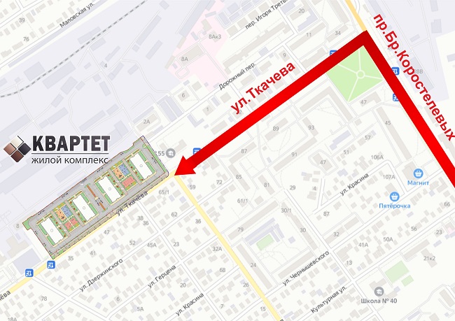 Следует отметить, что ЖК Квартет расположен в развитом районе города (ул.Ткачева, ориентир — школа № 55), где есть вся необходимая для комфортного проживания инфраструктура. Поблизости находятся магазины, школы, детские сады, аптеки, и другие объекты социальной инфраструктуры.