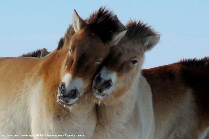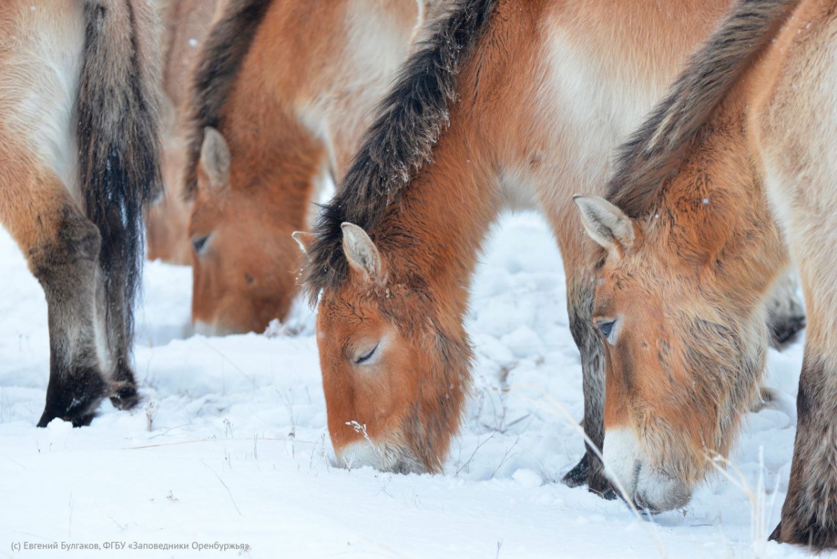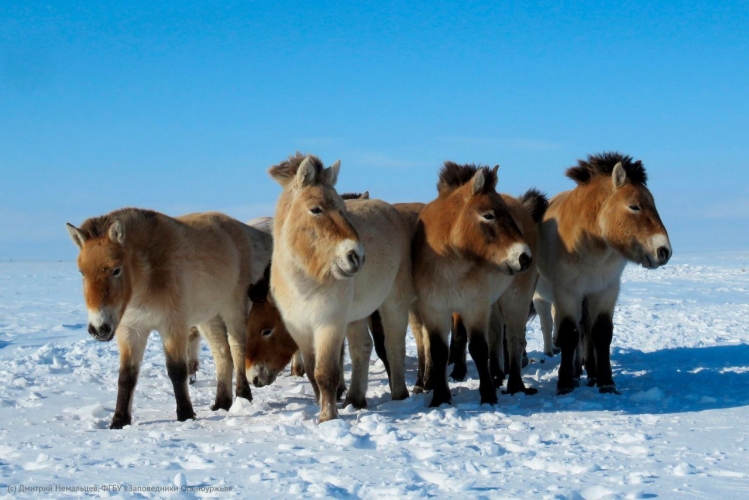 В объектив камеры инспектора Евгения Булгакова попали грациозные красавцы - лошадьми Пржевальского. Животные выглядят мокрыми, лохматыми, утопающими в сугробах, но всё же уже по-весеннему счастливыми. Они знают, что весна близко. Об этом им напоминает увеличение продолжительности светового дня и усиление солнечного тепла.