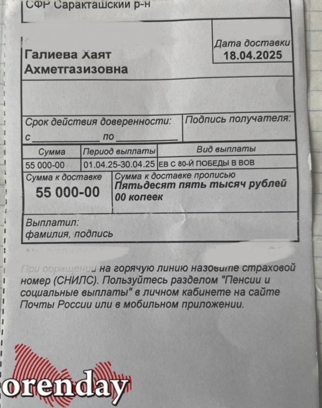 В этом году, в канун 80-летия Победы в Великой Отечественной войне, ей почему-то выплатили единовременную выплату в размере 55 000, а не 80 000 рублей.