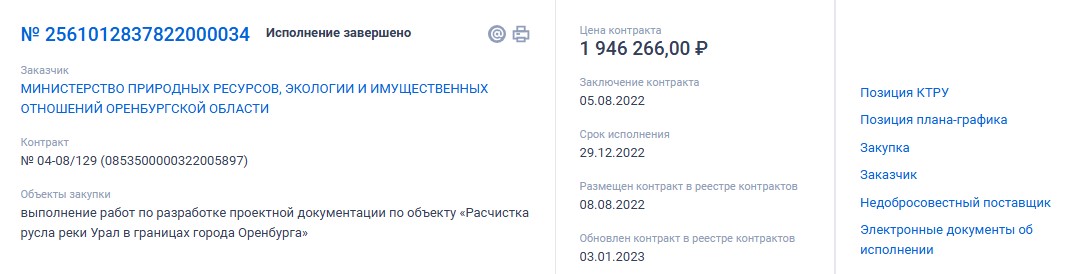 В 2022 году минприроды Оренбургской области отыграл тендер на разработку проектной документации по объекту «Расчистка русла реки Урал в границах Оренбурга». На эти работы готовы были потратить 6 381 200 рублей. ООО «Проектный институт территориального развития» из Краснодара, генеральным директором которого является Дмитрий Овчаров, взялся за разработку проекта за 1 946 266 рублей. Правда, проект составлялся, согласно контракту, на расчистку русла реки, протяженностью 7 километров.