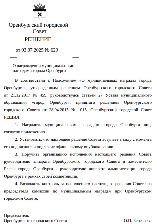 Ранее Почётной грамоты города Оренбурга удостоились экс-мэр Сергей Салмин, а также первый заместитель главы Оренбурга Вячеслав Объедков. Аналогичная награда полагается Елене Бочкарёвой и Владимиру Гирину.