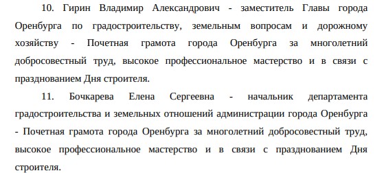 В настоящее время Бочкарёва - начальник департамента градостроительства и земельных отношений администрации Оренбурга. Ей, как и Гирину, вручат Почётную грамоту города Оренбурга за «многолетний» (а по факту всего три года!) добросовестный труд, высокое профессиональное мастерство и в связи с празднованием Дня строителя.