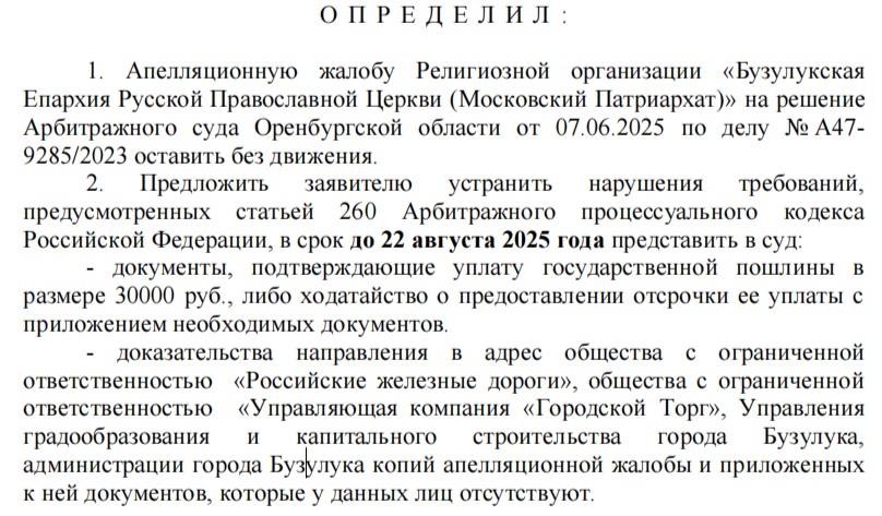 Бузулукская Епархия пытается оспорить решение - обратилась в Восемнадцатый арбитражный апелляционный суд, однако апелляционная жалоба подана с нарушением.