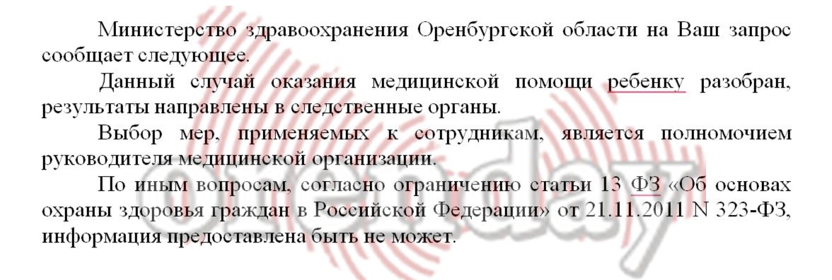 ... «данный случай оказания медицинской помощи ребёнку разобран, результаты направлены в следственные органы».