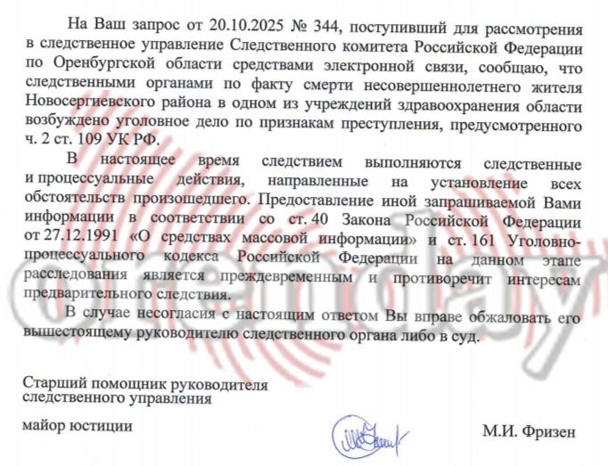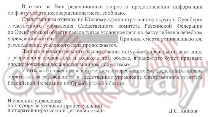Расследованием причины и обстоятельств гибели ребёнка занимается Следственный отдел по Южному административному округу г. Оренбурга следственного управления Следственного комитета Российской Федерации по Оренбургской области. Пытаясь разобраться в случившемся, мы направили запрос в прокуратуру региона, где нам пояснили, что «причины смерти устанавливаются, расследование уголовного дела продолжается», а все «данные предварительного расследования могут быть преданы огласке лишь с разрешения следователя и только в том объёме, в каком это будет признано уполномоченным должностным лицом допустимым».