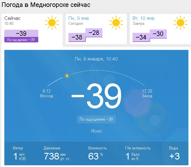 Отметим, что согласно данным gismeteo.ru, в 10:40 в Медногрске минус 39 градусов.