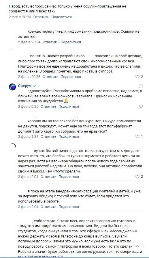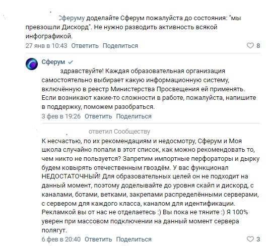"К несчастью, по рекомендациям и недосмотру Министерства Просвещения, «Сферум» и «Моя школа» случайно попали в реестр информационных систем. Как можно рекомендовать то, чем никто не пользуется? Запретим импортные перфораторы и дырку будем ковырять отечественным гвоздём. Функционал НЕДОСТАТОЧНЫЙ! Для образовательных целей он не подходит на данный момент, поэтому доделывать до уровня скайп и дискорд, с каналами, ботами, ветками, закрепами распределёнными серверами, с сервером для каждого класса, каналом для идентификации. Я 100 процентов уверен, при массовом подключении сервера полягут".