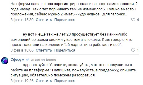 "Студентам стыдно даже показывать то, что безбожно тупит и тормозит и работает чуть ли не через раз. Хотя на вебинаре обещали после нового года серьёзно заняться работой над этим. Но пока, похоже, они активно поработали своим языком, чем что-то сделали. Я пока на этапе внедрения-регистрации учителей и детей, и уже за державу обидно. С тоской жду, что будет, если придется это использовать в работе".