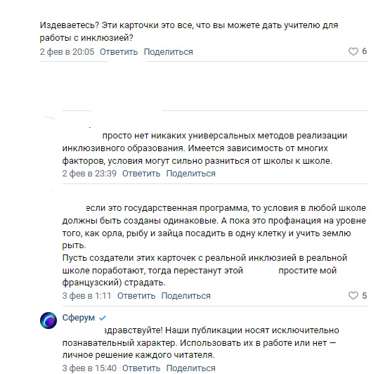 "Если это государственная программа, то условия в любой школе должны быть созданы одинаковые. А пока это профанация на уровне того, как орла, рыбу и зайца посадить в одну клетку и учить землю рыть. Пусть создатели этих карточек с реальной инклюзией в реальной школе поработают, тогда перестанут этой ерундой страдать".