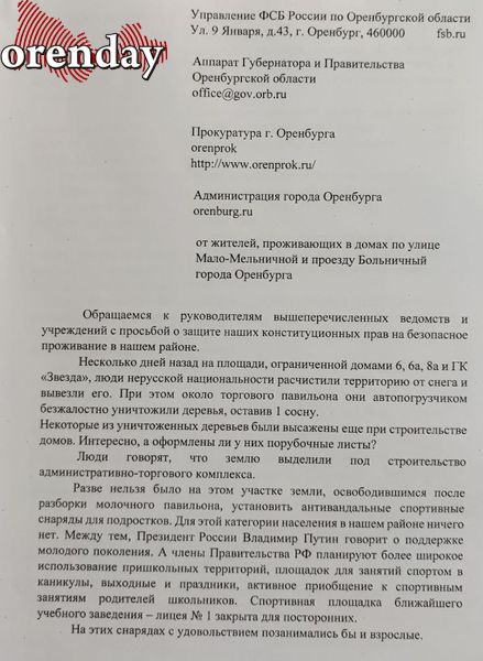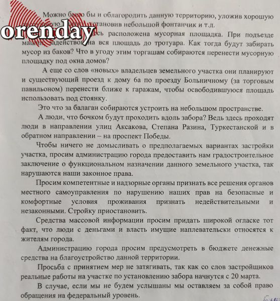 В настоящее время жители собрали список подписей против базара. Также написали письма в прокуратуру, аппарат губернатора, администрацию Оренбурга и управление ФСБ России по Оренбургской области. В случае, если оренбуржцев не услышат на местном уровне, обращения последуют на федеральный уровень и президенту РФ.