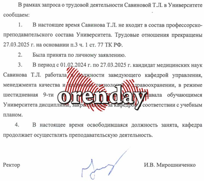 Как сообщил orenday.ru ректор Оренбургского государственного медицинского университета Игорь Мирошниченко, экс-министр здравоохранения Оренбургской области Татьяна Савинова была принята на работу в вуз по личному заявлению: