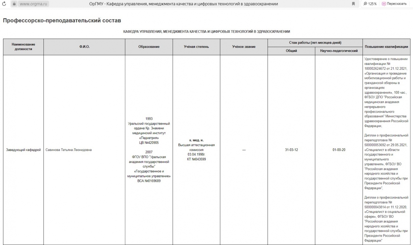 В период с 01.02.2024 г. по 27.03.2025 г. кандидат медицинских наук Савинова Т.Л. работала в должности заведующего кафедрой управления, менеджмента качества и цифровых технологий в здравоохранении, в режиме шестидневная 9-ти часовая рабочая неделя, - рассказал Игорь Васильевич.