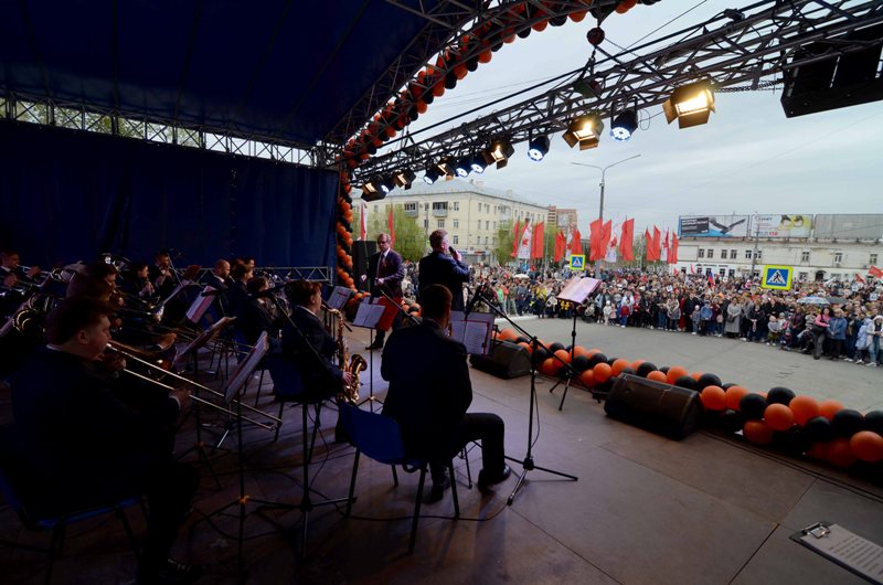 Под крики «Ура!» и военные песни оренбуржцы, гордо неся плакаты с изображением родных, прошлись от пересечения проспекта Победы с улицей Немовской до водонапорной башни, где их встретило выступление музыкантов в праздничном концерте «Музыка фронтового оркестра».