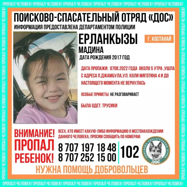 7 августа в поселке Джамбул Костанайской области произошла история с исчезновением ребенка, очень напоминающая пропажу Ярослава в Новосергиевском районе.